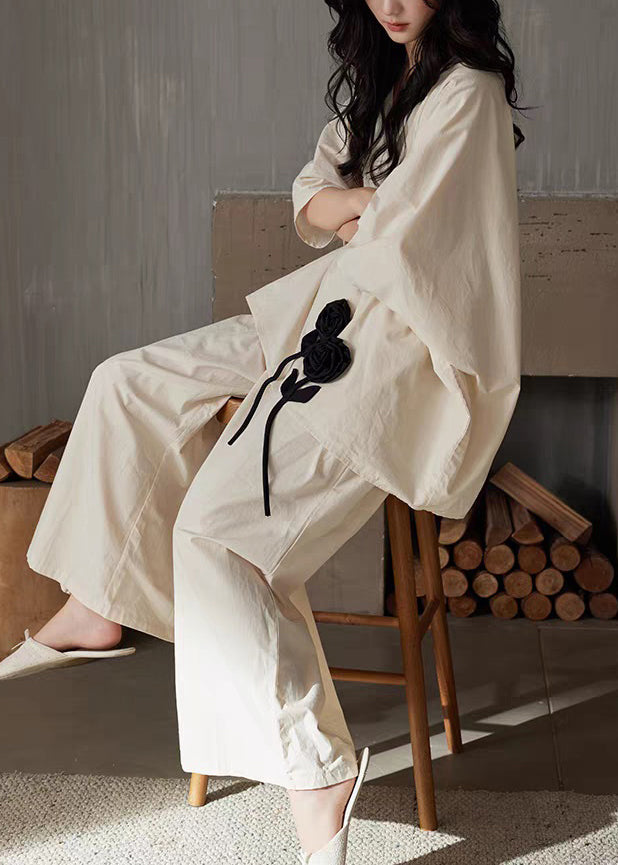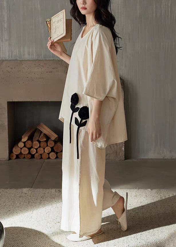Plus Size Apricot V Neck Floral Patchwork Cotton Two Pieces Set Bracelet Sleeve