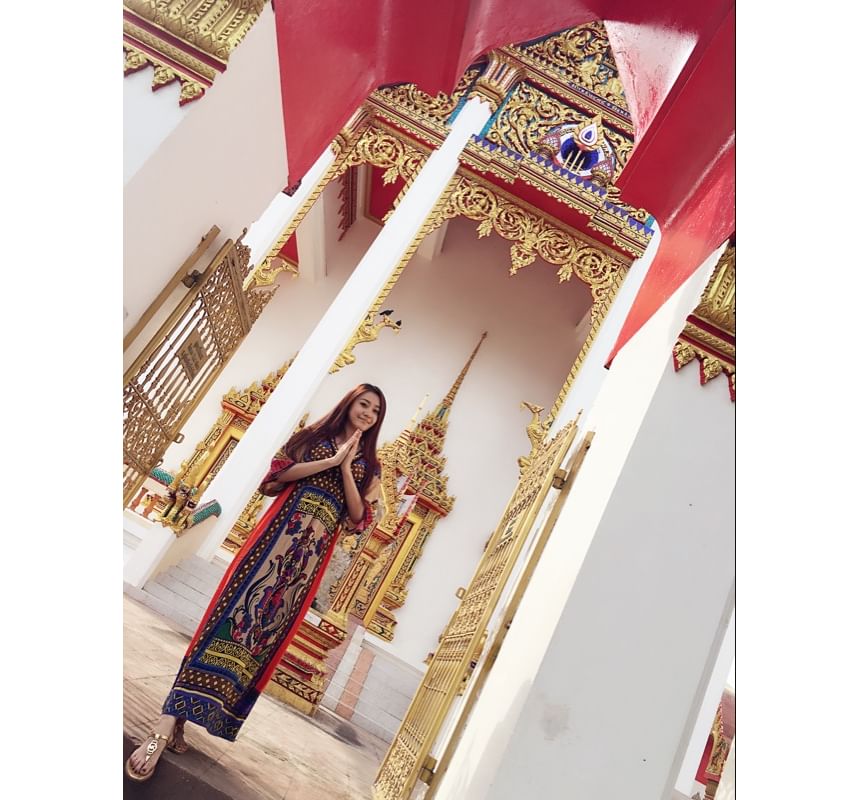 Elbow-Sleeve V-Neck Patterned Print Maxi A-Line Dress