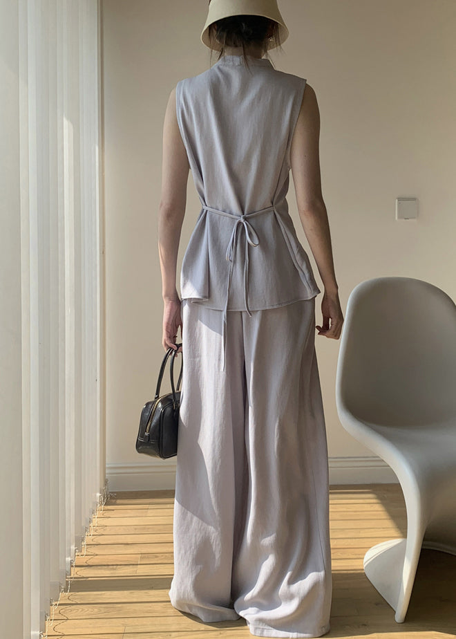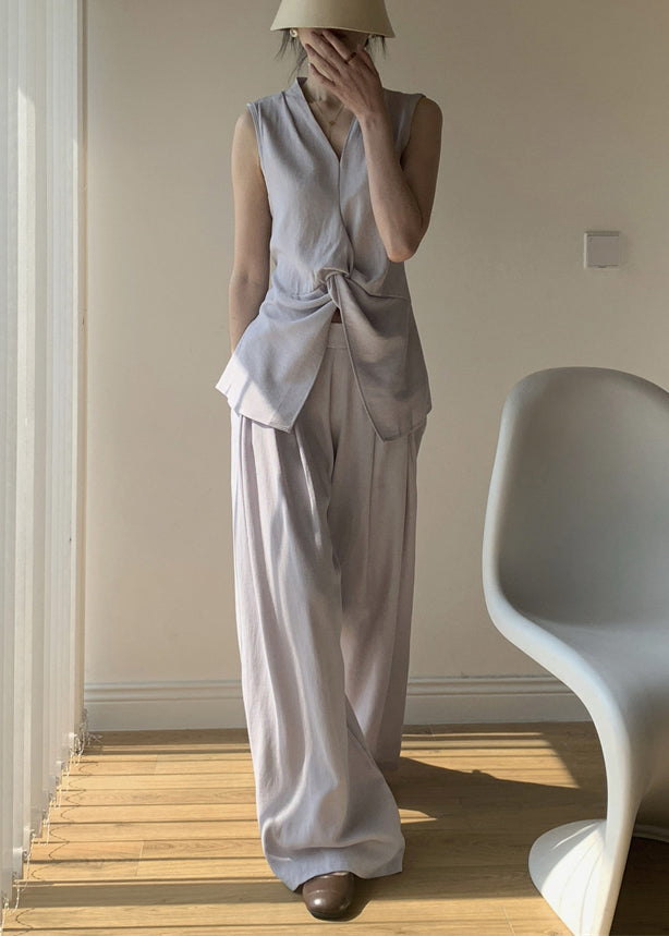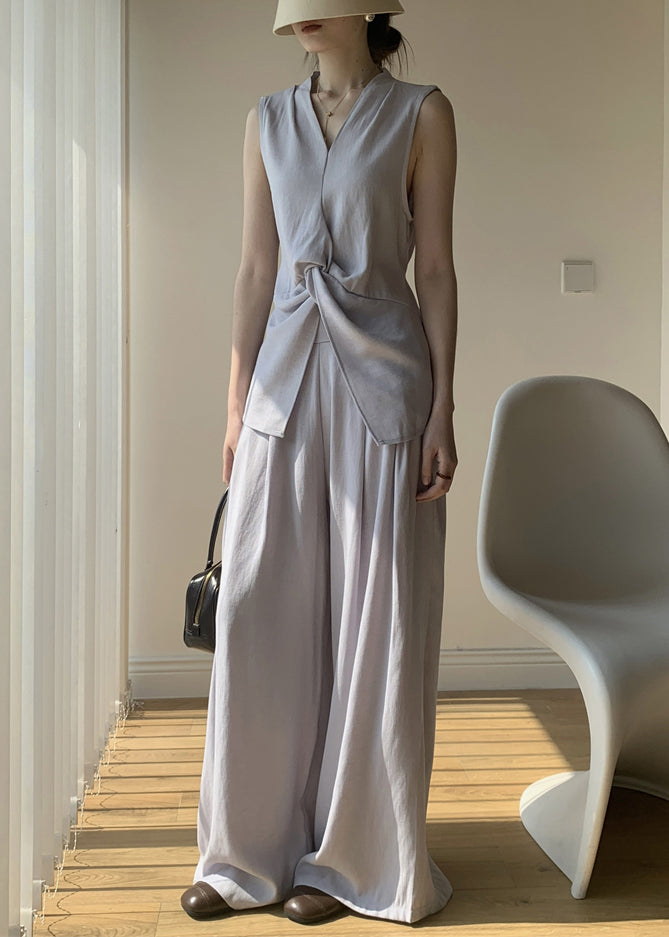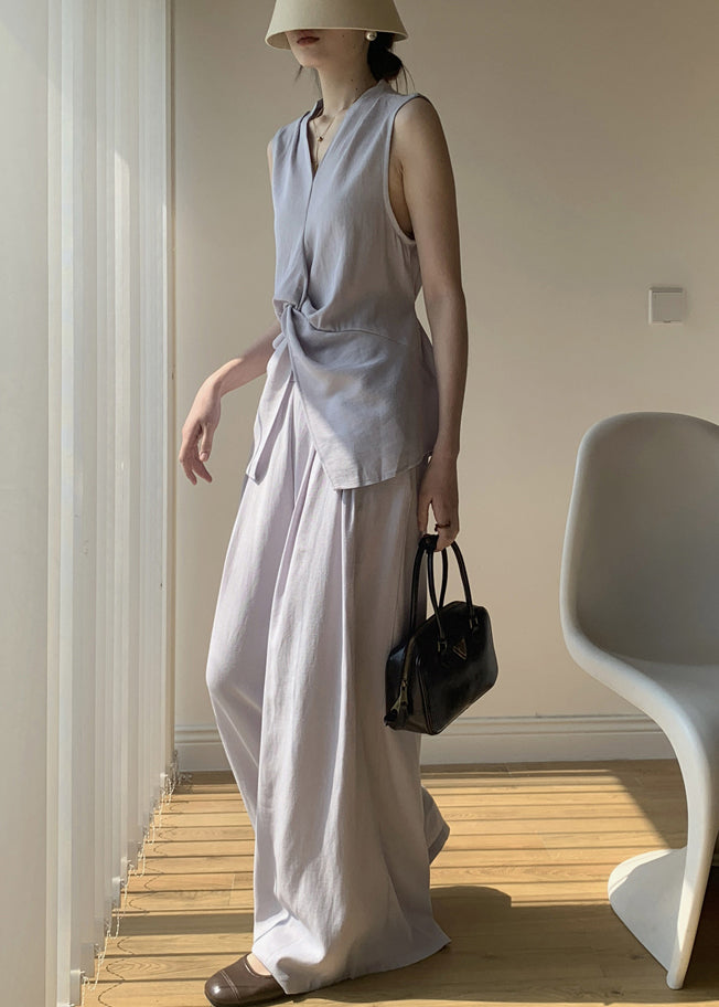 Light Purple Lace Up Solid Cotton Two Piece Set V Neck Summer