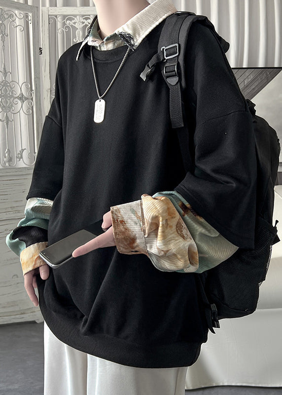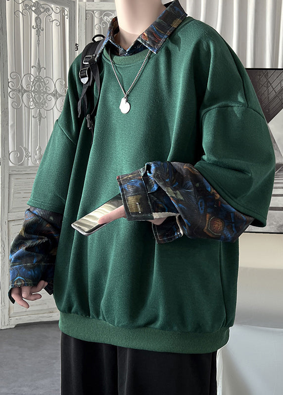 Lose Schwärzlich Grün Peter Pan Kragen Patchwork Falsche Zwei Stücke Baumwolle Herren