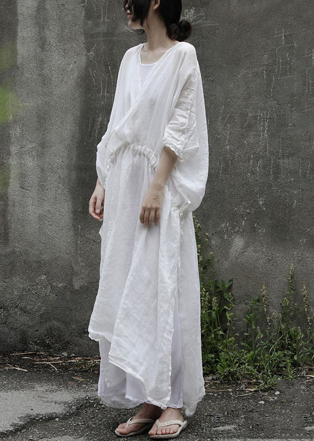 Lockeres weißes zweiteiliges Set aus Leinen mit seitlichem Kordelzug und halben Ärmeln MN093