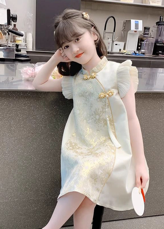 Elegante Gold Stehkragen Rüschen Taste Mädchen Urlaub Maxi Kleider Sommer