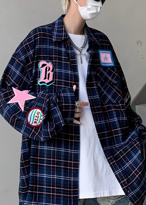 Französisch Navy Plaid Taschen Baumwolle Hemd Männer Frühling