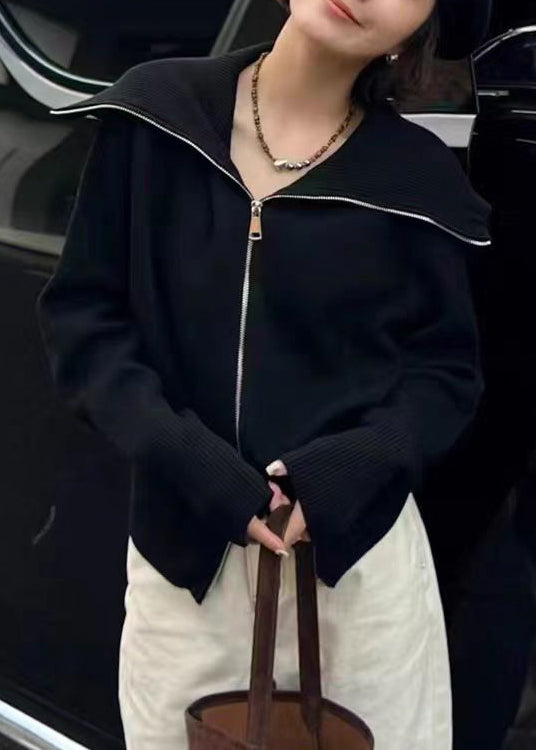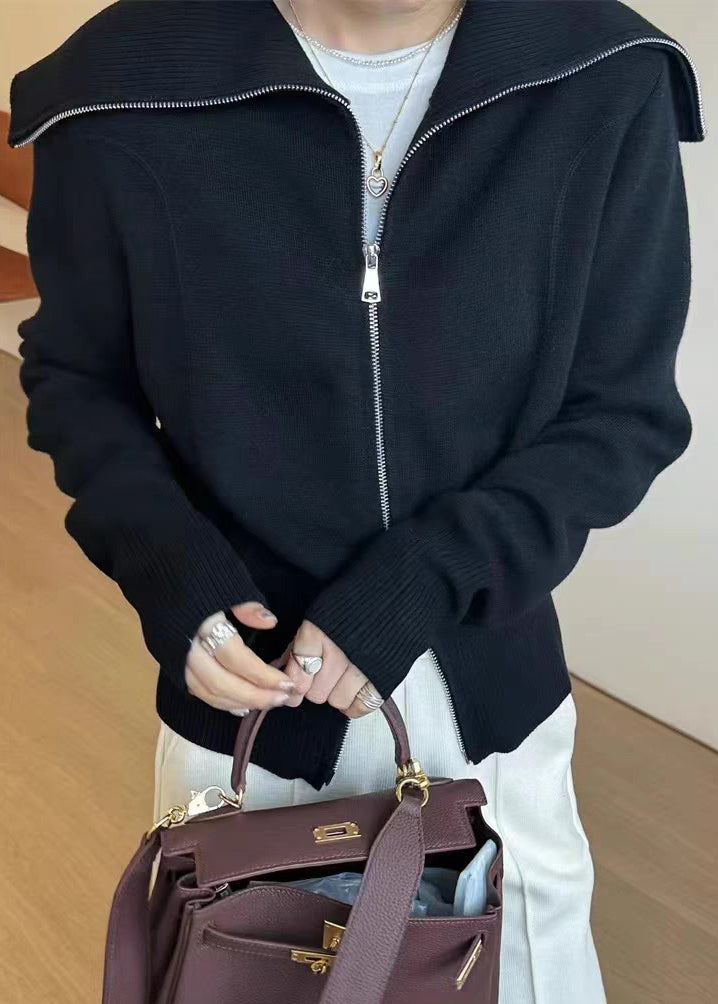 Neuer schwarzer Strickpullover mit Peter-Pan-Kragen und Reißverschluss, Herbst RY021