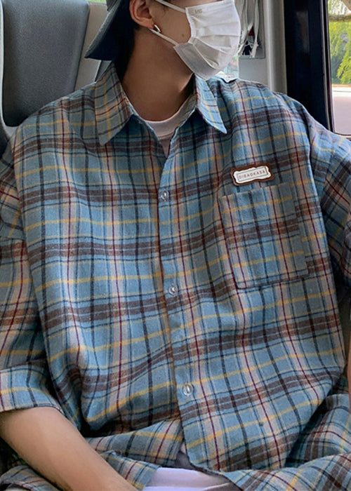 Plaid Sommer Beige Art Shirt Button Männer Baumwolle