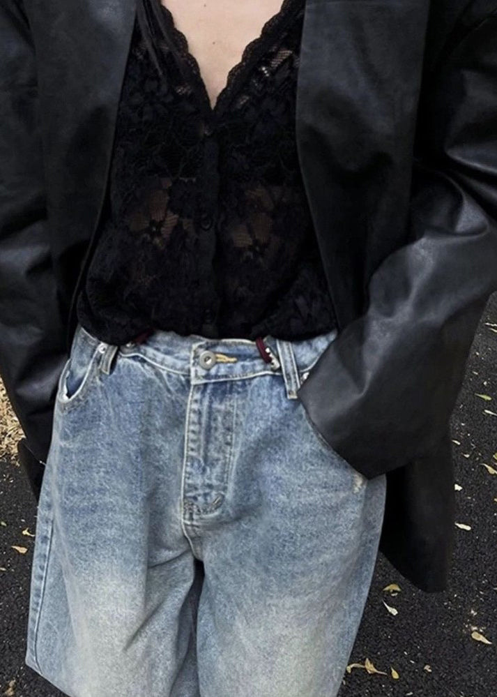 Bohemian Schwarz V-Ausschnitt Aushöhlen Spitze Hemd Frühling