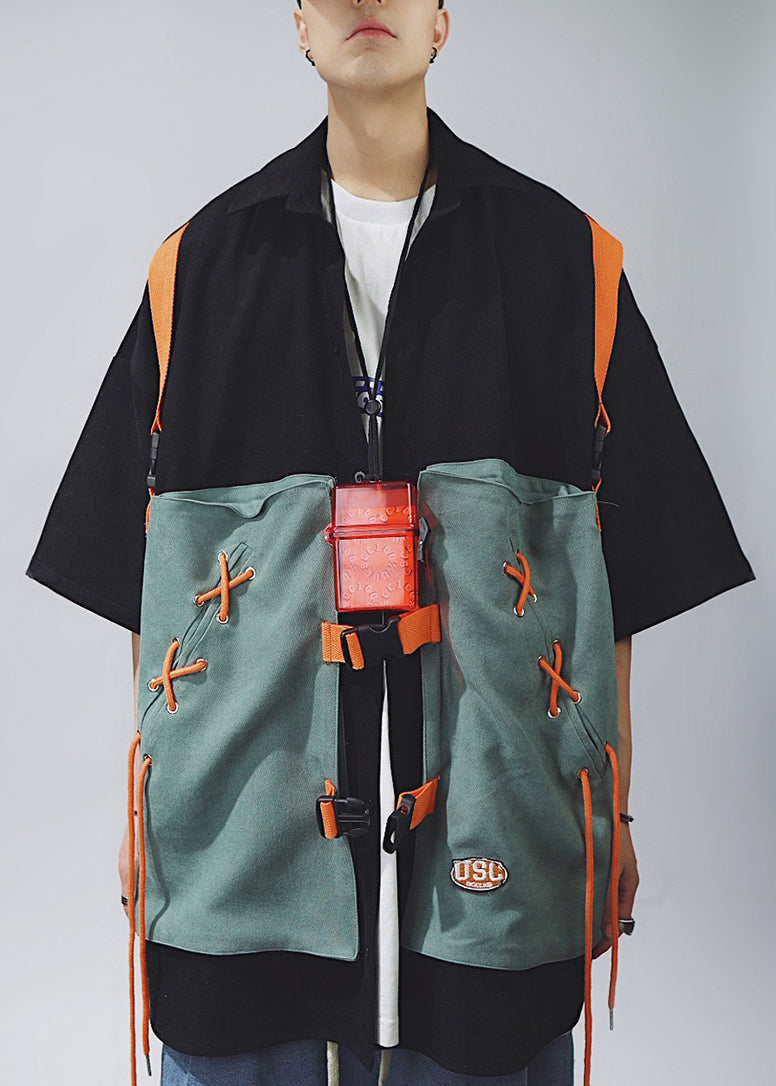 Schickes Khaki-T-Shirt mit Schnürung und Patchwork-Baumwolle für Herren, halbe Ärmel