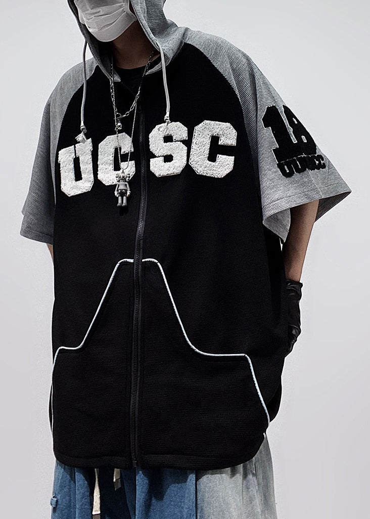 Größe Patchwork Baumwolle Schwarz Plus Kapuze Reißverschluss Männer Shirts T