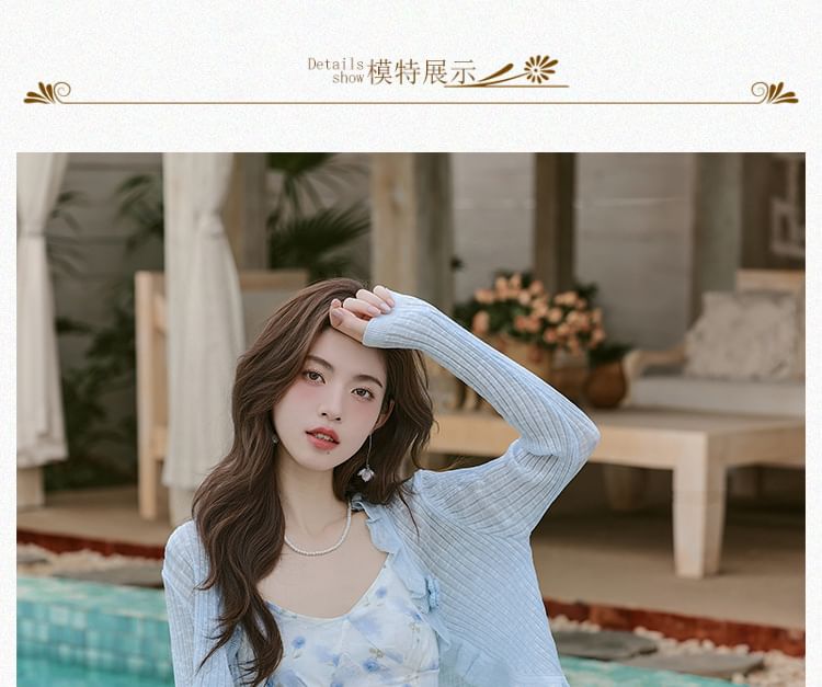 Spaghetti Strap V-Neck Floral Print Maxi A-Line Dress / Plain Ruffle Trim Sheer Crop Cardigan / Set