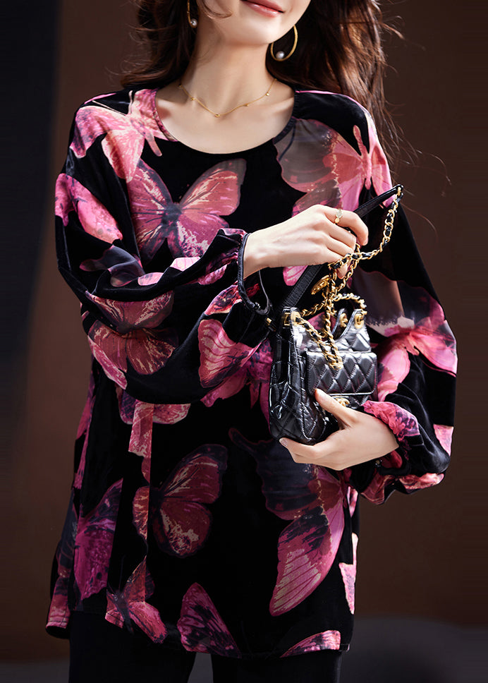 Gönnen Sie sich Luxus mit unserem einzigartigen, langärmligen Velours-Top mit Rundhalsausschnitt und rosa Aufdruck. Dieses Top aus feinstem Veloursstoff verfügt über einen einzigartigen, rosa Aufdruck und ein schmeichelhaftes Rundhalsdesign. Werten Sie Ihre Garderobe mit diesem exklusiven und eleganten Stück auf.
