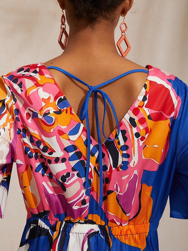 Fabric: Satin, Gender: Women's, Design: Floral, Occasion: Casual, Style: Statement, Modern, Bohemian, Vacation, Fabric Properties: LuxeSatin - Discover the essence of quiet luxury in our exclusive Subtly Glossy Luxe Satin, it is drapey and sleek like silk., Neckline: V Neck, Deep V, Sleeve Length: Half-Sleeve, Half Sleeve, Elasticity: Inelastic, Look After Me: Machine wash, Dress Length: Knee-length, Pattern: Floral, Abstract, animal print, Season: Spring & Summer, Summer, Spring, Looseness: Loose Fit,