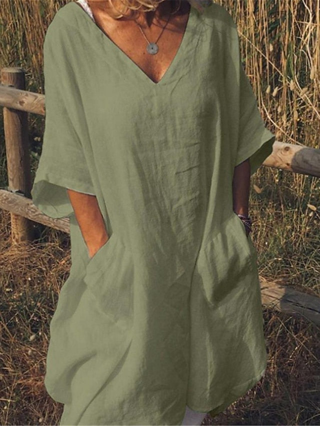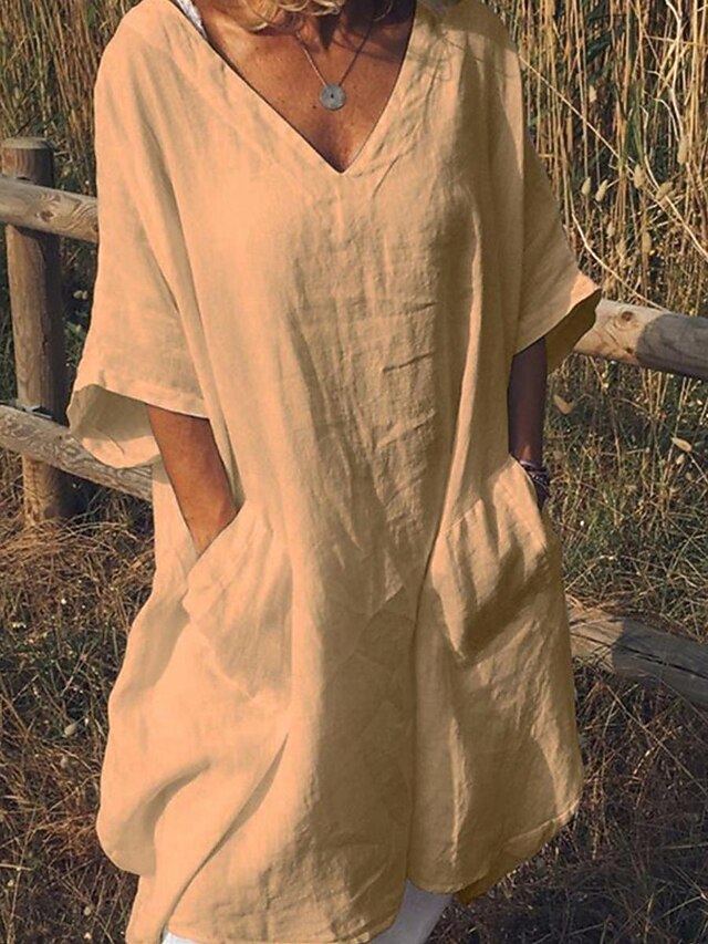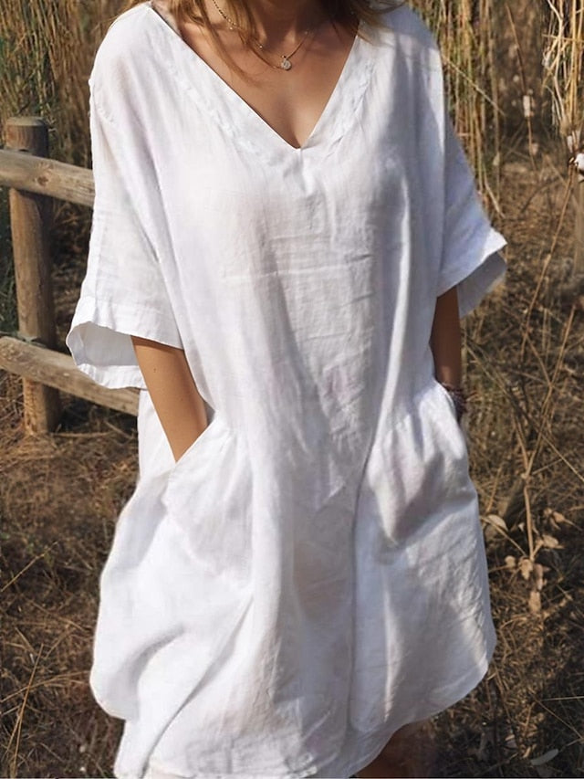 Dresses Type: Faux Cotton Linen, White Dress, Casual Dress, Shirt Dress, Fabric: Polyester, Linen texture style, Gender: Women's, Design: Pocket, Occasion: Daily, Weekend, Style: Basic, Modern, Print Type: non-printing, Fit Type: Loose Fit, Dress Length Type: Midi Dress, Neckline: V Neck, Sleeve Length: Half Sleeve, Elasticity: Inelastic, Look After Me: Machine wash, Pattern: Plain, Season: Summer, Spring,