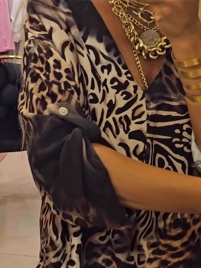 Dresses Type: Casual Dress, Shift Dress, Fabric: Polyester, Gender: Women's, Design: Print, Occasion: Work, Daily, Vacation, Date, Style: Stylish, Casual, Fit Type: Loose Fit, Dress Length Type: Maxi Dress, Neckline: V Neck, Sleeve Length: Long Sleeve, Elasticity: Inelastic, Look After Me: Hand wash, Machine wash, Pattern: Leopard, Season: Fall, Summer, Spring,
