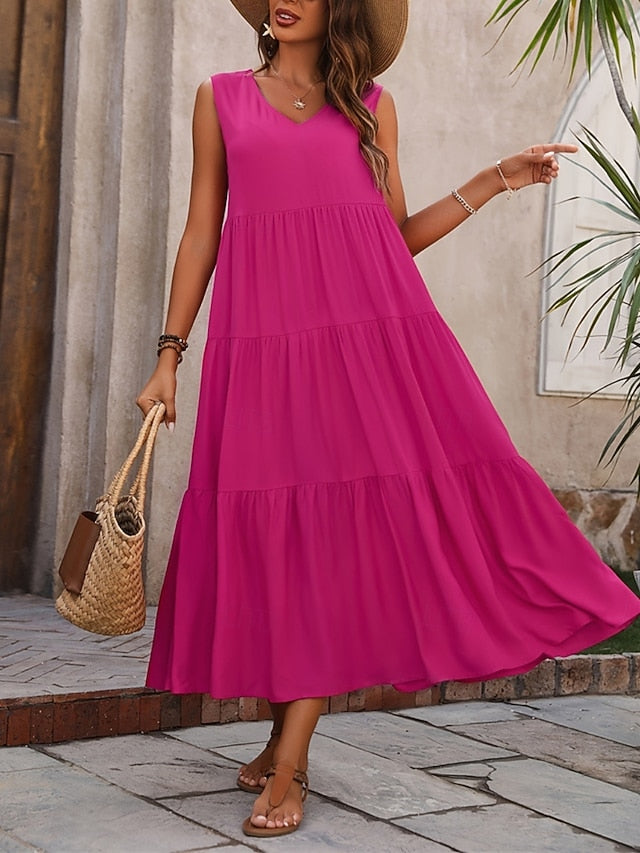 Dresses Type: Casual Dress, Swing Dress, A Line Dress, Fabric: Polyester, Gender: Women's, Design: Ruffle, Occasion: Daily, Vacation, Style: Stylish, Basic, Casual, Fit Type: Regular Fit, Dress Length Type: Maxi Dress, Neckline: V Neck, Sleeve Length: Sleeveless, Elasticity: Micro-elastic, Look After Me: Hand wash, Machine wash, Pattern: Plain, Season: Summer, Spring,
