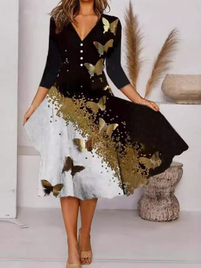 Dresses Type: A Line Dress, Fabric: Polyester, Gender: Women's, Design: Print, Buttons, Occasion: Outdoor, Going out, Style: Casual, Print Type: Print, Fit Type: Standard Fit, Dress Length Type: Midi Dress, Neckline: V Neck, Sleeve Length: 3/4 Length Sleeve, Elasticity: Micro-elastic, Look After Me: Hand wash, Machine wash, Pattern: Graphic, Floral, Season: Spring, Fall,