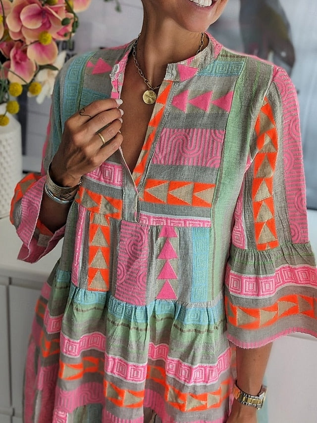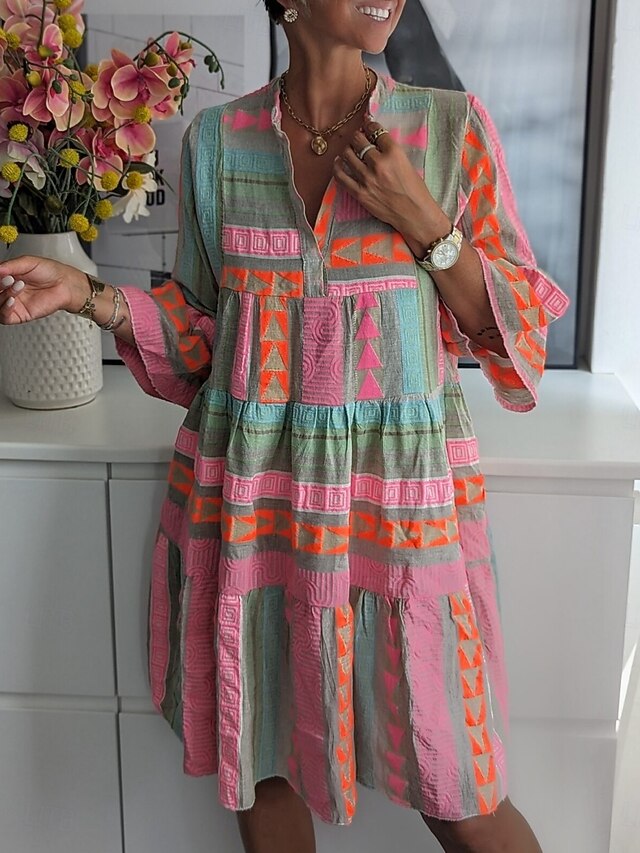 Dresses Type: Boho Dress, Casual Dress, Swing Dress, Fabric: Polyester, Gender: Women's, Design: Print, Occasion: Daily, Style: Casual, Fit Type: Regular Fit, Dress Length Type: Mini Dress, Neckline: V Neck, Sleeve Length: 3/4 Length Sleeve, Elasticity: Micro-elastic, Look After Me: Hand wash, Dry clean only, Machine wash, Pattern: Geometric, Season: Fall, Summer, Spring,