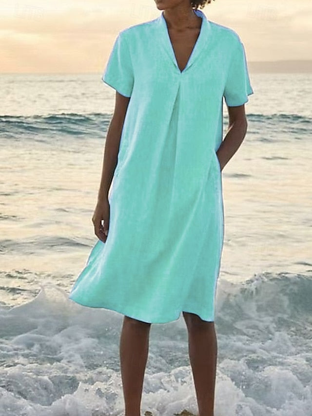 Dresses Type: Summer Dress, Sundress, Fabric: 95%Cotton 5%Polyester, Linen texture style, Gender: Women's, Occasion: Daily, Design: Pocket, Style: Casual, Beach, Dress Length Type: Mini Dress, Neckline: V Neck, Sleeve Length: Short Sleeve, Pattern: Plain, Season: Summer,