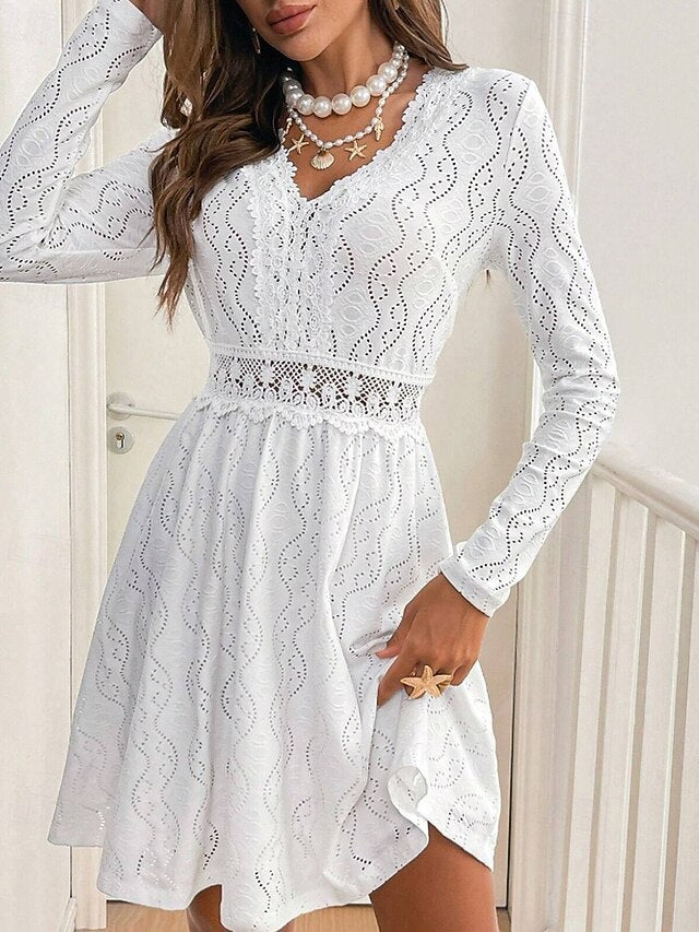 Dresses Type: Lace Dress, White Dress, Fabric: Polyester, Gender: Women's, Design: Lace, Occasion: Weekend, Vacation, Going out, Style: Modern, Fit Type: Regular Fit, Dress Length Type: Mini Dress, Neckline: V Neck, Sleeve Length: Long Sleeve, Elasticity: Inelastic, Look After Me: Hand wash, Machine wash, Pattern: Plain, Season: Summer, Spring,