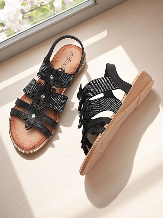 Gender:                                            Women's,                                                                        Category:                                            Sandals,                                                                        Style:                                            Bohemia,                        Vacation,                                                                        Occasion:                                            Daily,                        Vacation,                                                                        Toe Shape:                                            Round Toe,                                                                        Upper Materials:                                            PU,                                                                        Lining Materials:                                            Synthetic Leather,                                                                        Outsole Materials:                                            Rubber,                                                                        Embellishment:                                            Flower,                        Rivet,                                                                        Season:                                            Summer,                        Spring,                                                                        Size Suggestion:                                            standard size, select your usual size,                                                                        Closure Type:                                            Loafer,                                                                        2025 Trends:                                            Boho Beach,                                                                        Strap Type:                                            T-Strap,                                                                        Heel Height(inch):                                            1.18,                                                                        Heel Type:                                            Low Heel,