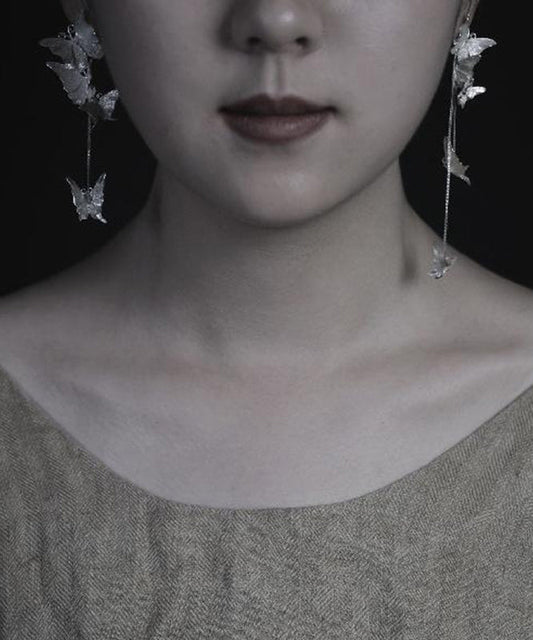 Boucles d'oreilles pendantes uniques en argent sterling blanc avec motif papillon en émail asymétrique QJ009