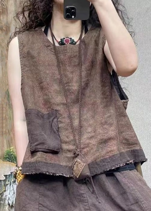 Gilet en lin bleu vintage à col rond et poches imprimées sans manches VV011