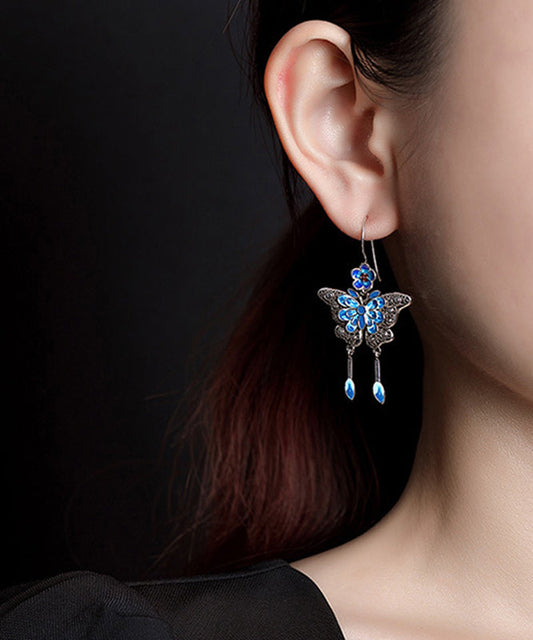 Boucles d'oreilles pendantes à pampilles en argent sterling bleu avec papillon et fleur de prunier Vintage Boutique QJ026