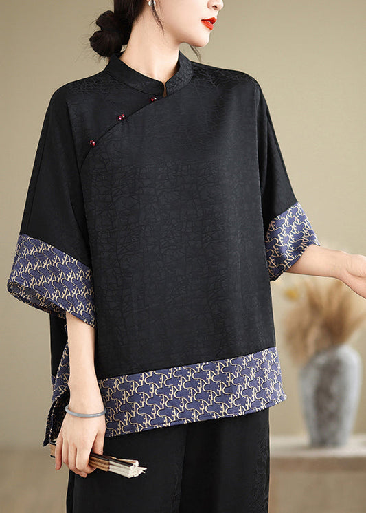 Chemisier vintage bleu à col montant et patchwork en soie jacquard, printemps LY0139