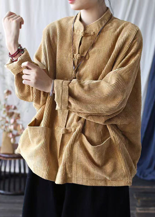 Veste vintage en velours côtelé bleu avec poches et boutons chinois, printemps TJ025