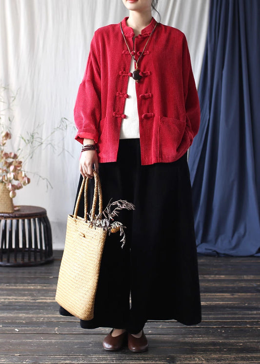 Vestes vintage en velours côtelé rouge avec poches à boutons chinois, printemps TJ015