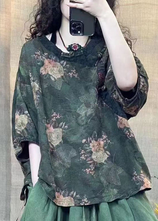 Chemises en lin à imprimé oriental vintage rouge à col rond et manches bracelet FF024