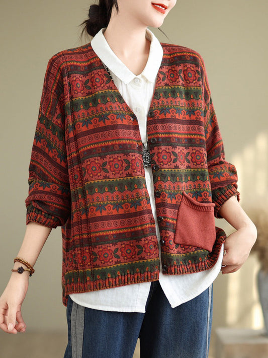 Pull à col en V boutonné à fleurs artistiques pour femmes AT1082