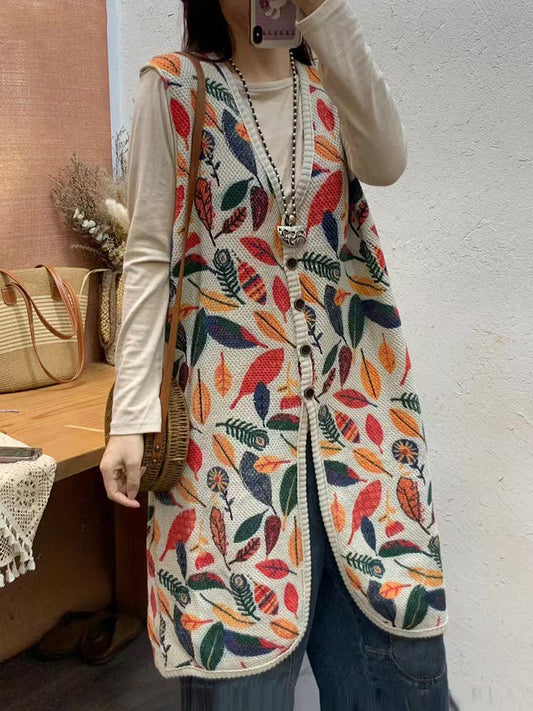 Gilet en tricot à col en V et imprimé feuilles artistiques pour femme, automne, AH1036