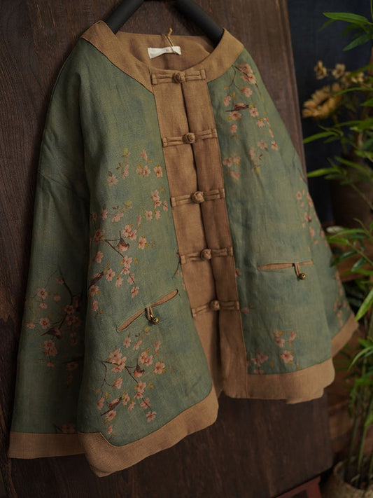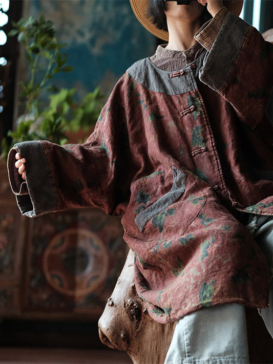 Manteau en lin à blocs de couleurs pour femmes, motif floral ethnique, automne AI1060