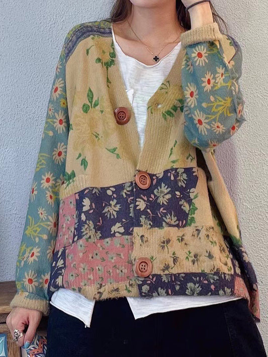 Pull cardigan en tricot à col en V et à imprimé floral pour femme, collection automne AT1047