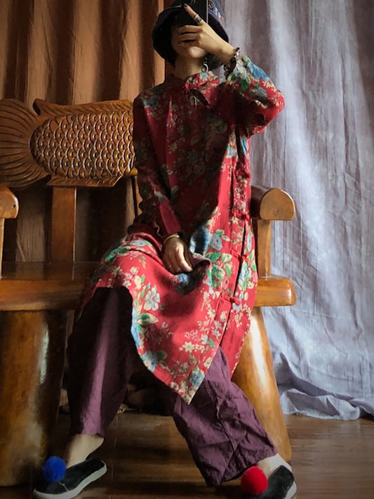 Manteau long à fleurs ethniques pour femmes, 100 % coton, AT1006