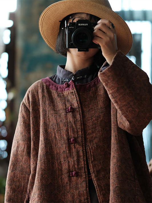Manteau matelassé en lin à col rond et boutons ethniques pour femmes AI1059
