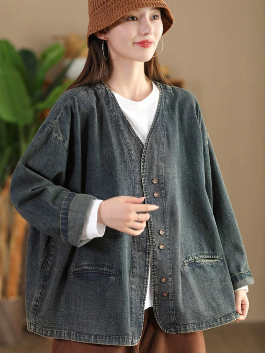 Manteau en jean à col en V de couleur pure vintage pour femme AT1039