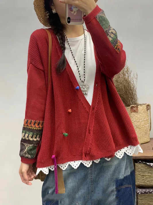 Pull en tricot à col en V et patch vintage pour femme AS1025