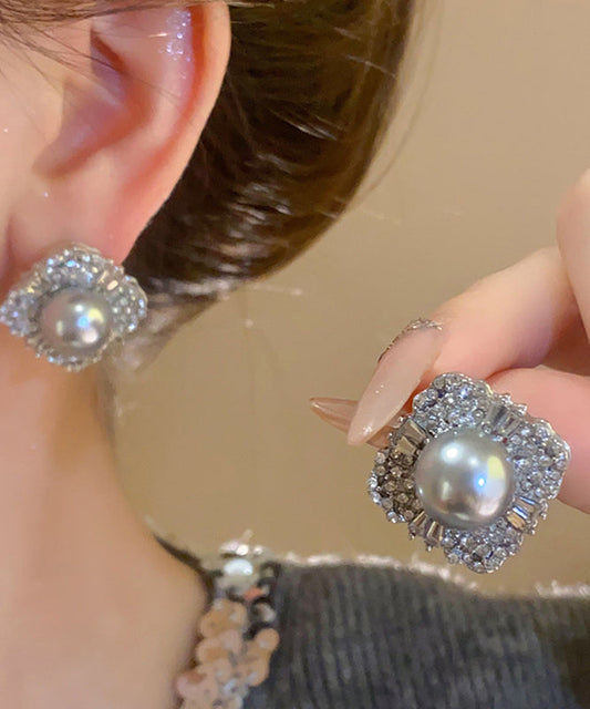 Boucles d'oreilles à tige en alliage gris avec perles et zircons 2024 PO054