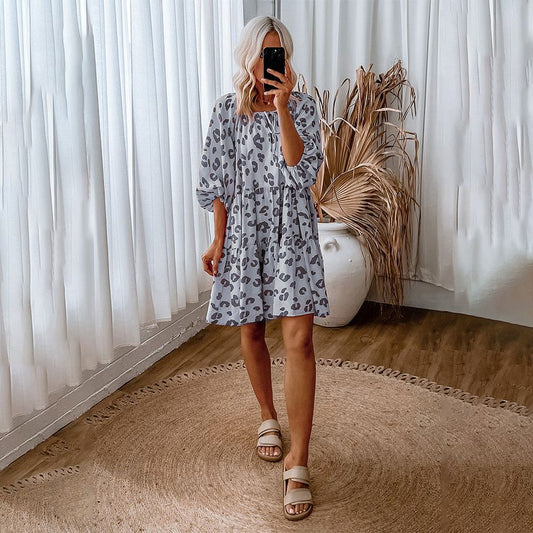Robe trapèze courte à imprimé léopard et manches aux coudes AH301