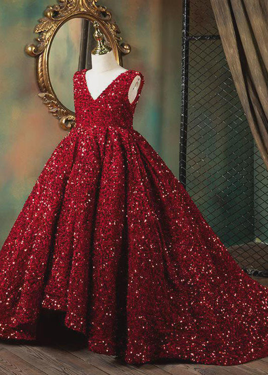 Robe longue rouge à col en V et paillettes pour fille, sans manches, YS001