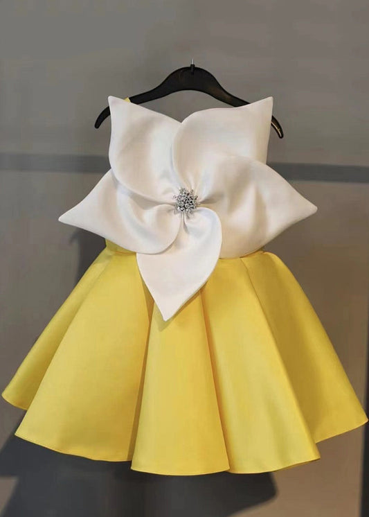 Robe longue sans manches en tulle brodé jaune à col montant pour enfants YS007