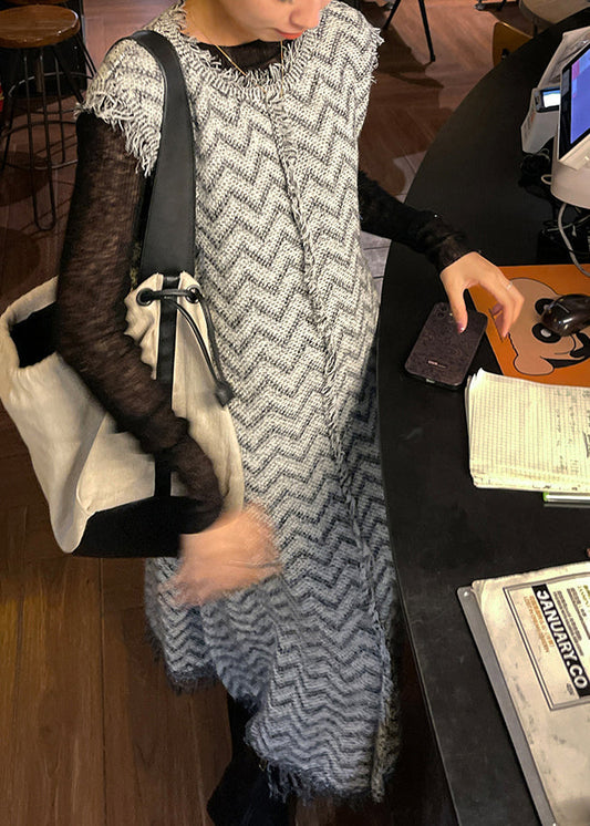 Robe gilet en tricot bleu élégant à pompons sans manches RL013