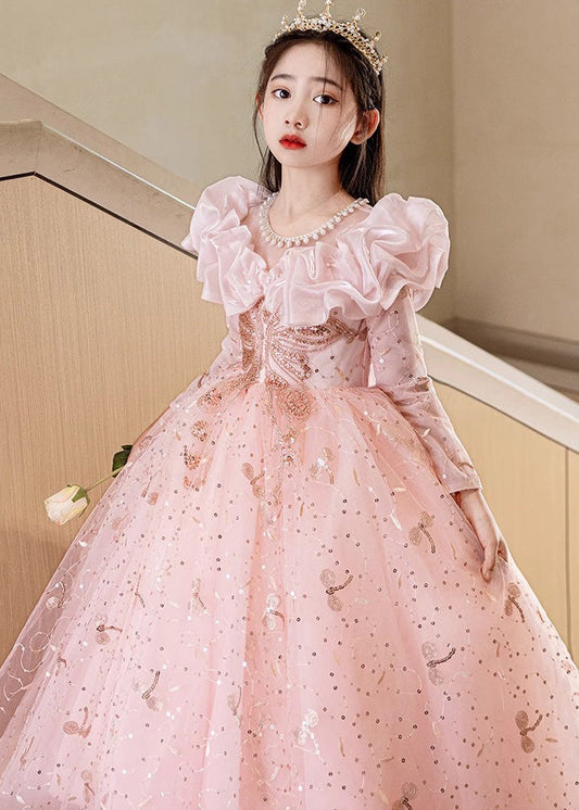 Robe longue en tulle brodée rose pour enfant, automne RP037