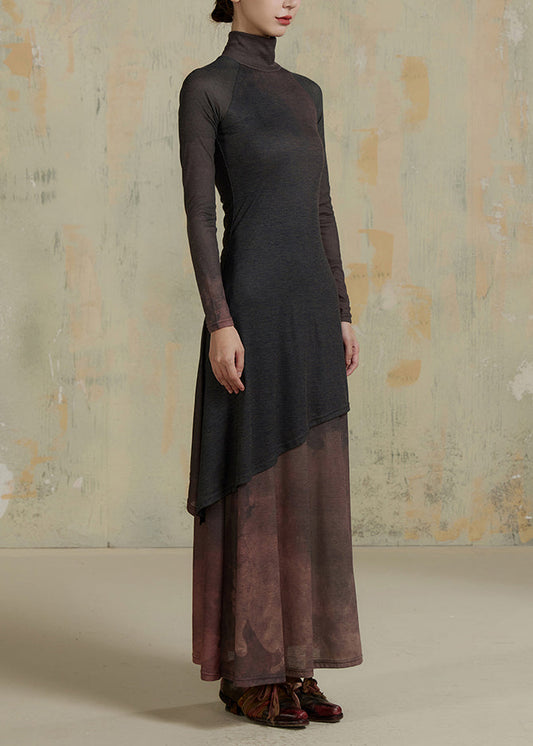 Robe longue ample grise à col montant et imprimé cachemire, automne WN008