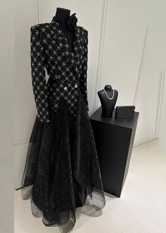Robe longue en tulle patchwork à carreaux noirs coupe slim automne WZ024