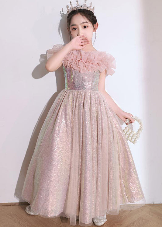 Robe longue en tulle à paillettes et col rond pour enfants, élégante et rose, sans manches, QV009