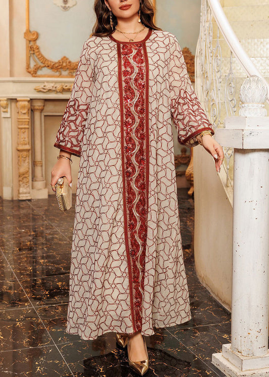 Robe longue d'automne en tulle brodée rouge à col rond QL019