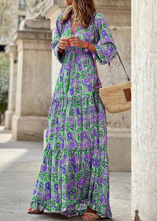 Robe en coton imprimé bohème vert à col rond et manches courtes QA010