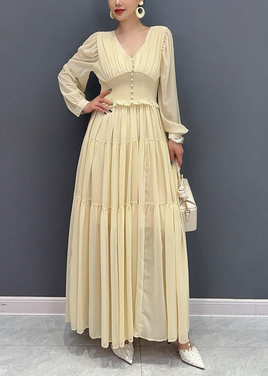 Robe longue en mousseline de soie jaune à volants et col en V grande taille Automne AY1015